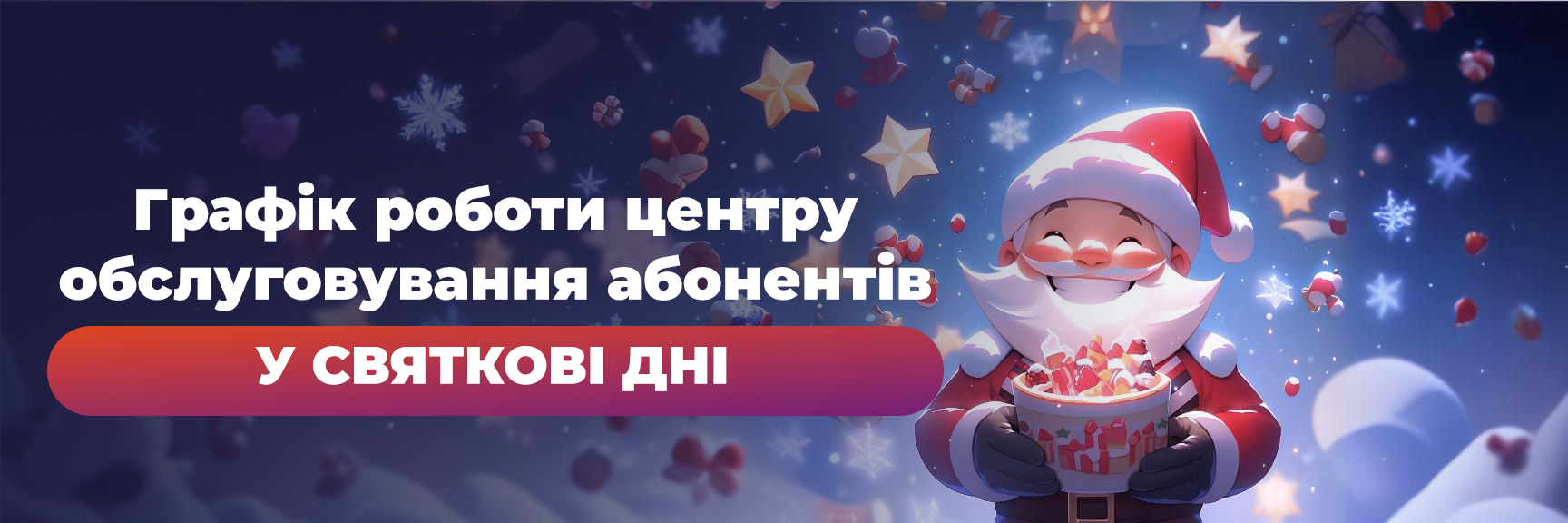 Шановні абоненти! Звертаємо вашу увагу, що 25 грудня (Різдво) та 1 січня (Новий рік) наш Центр обслуговування абонентів за адресою вул. Перемоги, 53 не працюватиме.